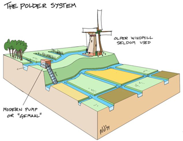 Schiphol is egy polderen, azaz a vízszintnél alacsonyabban fekvő, víztől elhódított földdarabon fekszik. A poldereket az összesen mintegy 2400 km hosszú gátrendszerrel, az országot átszövő csatornahálózattal és folyamatos vízszivattyúzással védik. A jó öreg szélmalmok is itt jönnek a képbe :) A víz elleni állandó küzdelem fontosságát semmi sem mutatja jobban, mint az a tény, hogy Hollandia területének csaknem 40%-a tengerszint alatt fekszik.